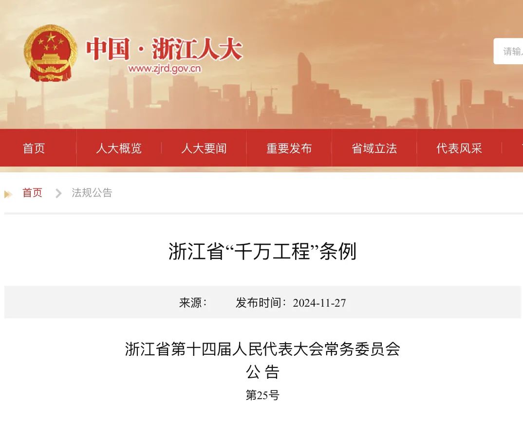 《浙江省“千萬(wàn)工程”條例》已于2024年11月27日經(jīng)浙江省第十四屆人民代表大會(huì)常務(wù)委員會(huì)第十三次會(huì)議通過(guò),現(xiàn)予公布,自2025年1月1日起施行。 浙江省人......