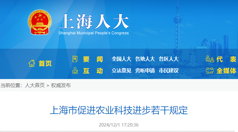 上海市人民代表大會(huì)常務(wù)委員會(huì)公告《上海市促進(jìn)農(nóng)業(yè)科技進(jìn)步若干規(guī)定》已由上海市第十六屆人民代表大會(huì)常務(wù)委員會(huì)第十七次會(huì)議于2024年11月28日修訂通過(guò),現(xiàn)予公布......