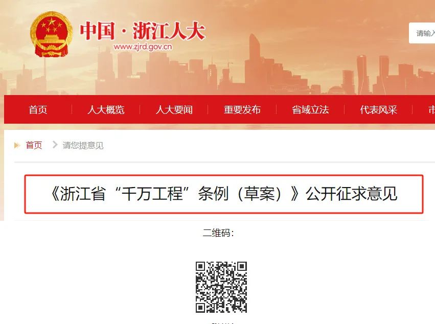 《浙江省“千萬工程”條例(草案)》已經(jīng)省十四屆人大常委會第十一次會議審議?,F(xiàn)將草案和說明予以公布。社會公眾可以掃描二維碼將意見反饋至省人大常委會法工委。意見征集......
