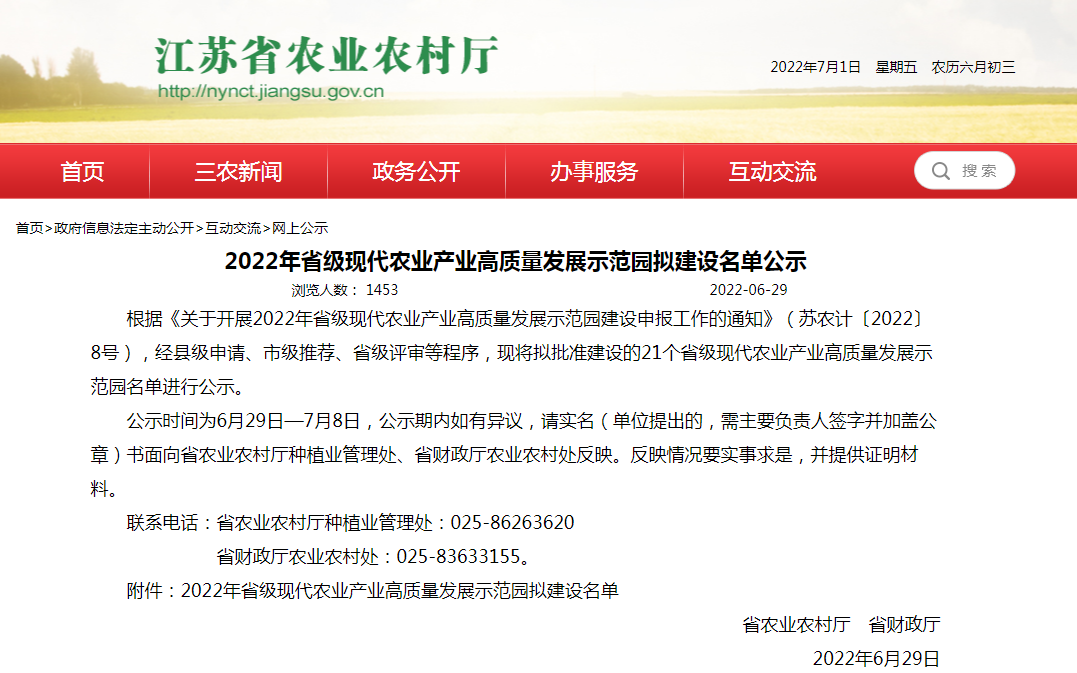根據(jù)《關(guān)于開展2022年省級(jí)現(xiàn)代農(nóng)業(yè)產(chǎn)業(yè)高質(zhì)量發(fā)展示范園建設(shè)申報(bào)工作的通知》(蘇農(nóng)計(jì)〔2022〕8號(hào)),經(jīng)縣級(jí)申請、市級(jí)推薦、省級(jí)評(píng)審等程序,現(xiàn)將擬批準(zhǔn)建設(shè)的2......