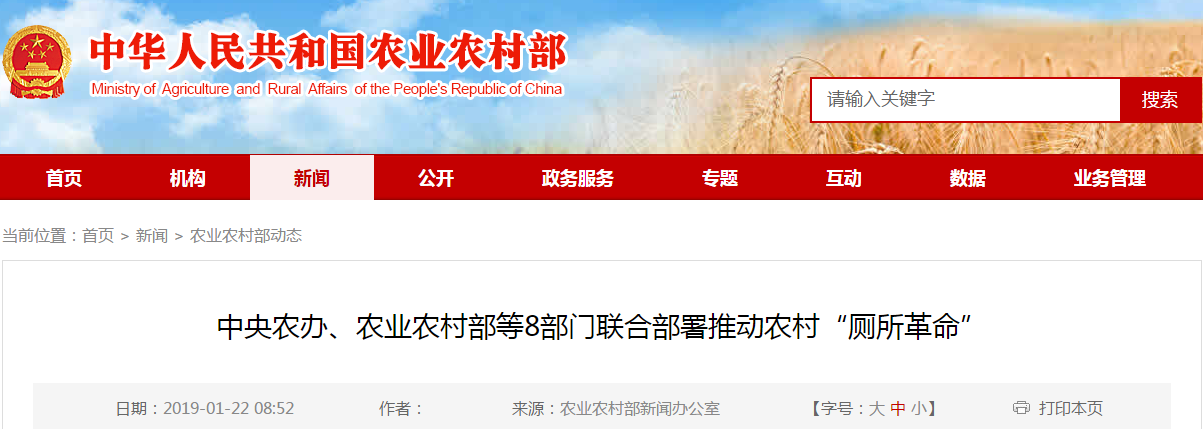 近日,中央農(nóng)辦、農(nóng)業(yè)農(nóng)村部、國家衛(wèi)生健康委、住房城鄉(xiāng)建設(shè)部、文化和旅游部、國家發(fā)展改革委、財政部、生態(tài)環(huán)境部等8部委聯(lián)合印發(fā)了《關(guān)于推進(jìn)農(nóng)村“廁所革命”專項行動......