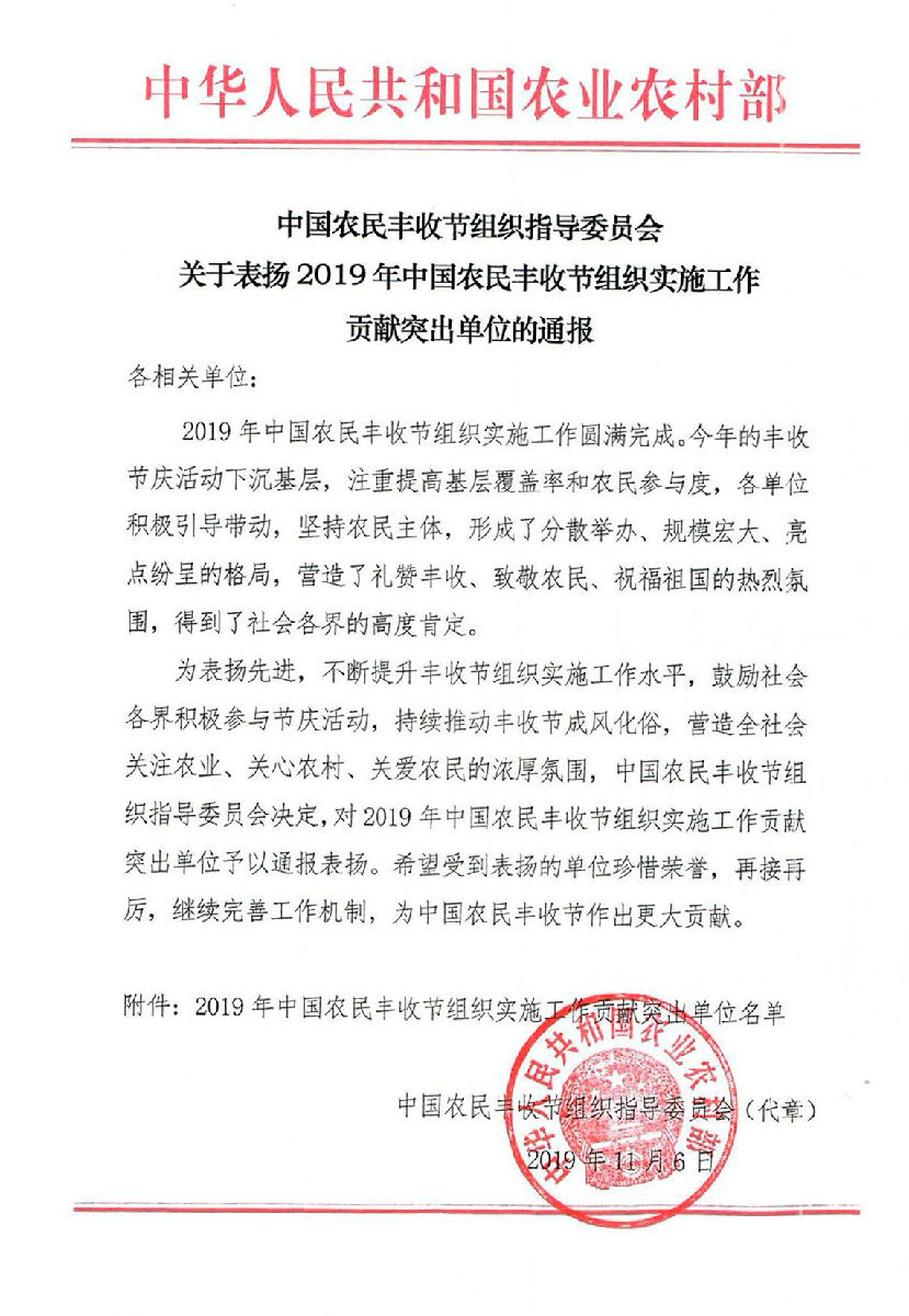 圖:由農(nóng)業(yè)農(nóng)村部牽頭組織成立的中國(guó)農(nóng)民豐收節(jié)組織指導(dǎo)委員會(huì),對(duì)中國(guó)農(nóng)業(yè)大學(xué)農(nóng)業(yè)規(guī)劃科學(xué)研究所、中國(guó)銀聯(lián)等2019年豐收節(jié)期間貢獻(xiàn)突出單位予以表彰