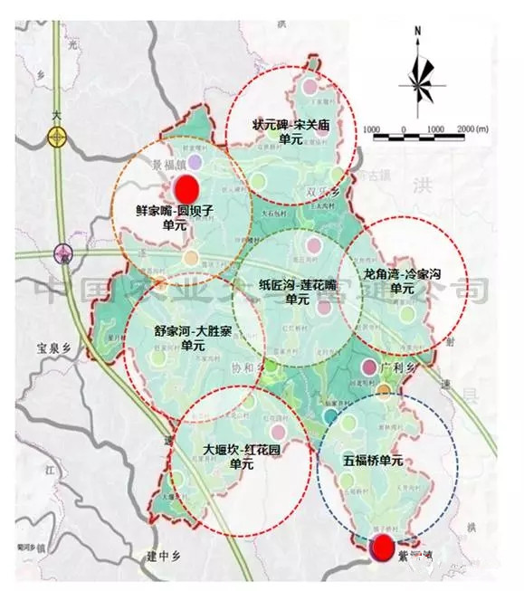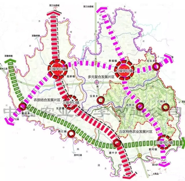 而中農(nóng)富通規(guī)劃設(shè)計的另一個項目“四川省綿陽市農(nóng)村綜合改革試驗區(qū)”則是“一村一體”模式的農(nóng)業(yè)綜合體,其規(guī)劃定位為:產(chǎn)村一體互動相融、丘區(qū)地域風(fēng)貌獨(dú)特的四川省丘區(qū)重點(diǎn)扶貧開發(fā)樣板區(qū)、四川省農(nóng)村綜合改革試驗先行區(qū)、四川省丘區(qū)生態(tài)綠色農(nóng)業(yè)和幸福美麗新村示范點(diǎn)。采用“重點(diǎn)鄉(xiāng)鎮(zhèn)+示范園區(qū)“、”中心村+生產(chǎn)基地” 發(fā)展模式,近期優(yōu)先扶植培育多個現(xiàn)代農(nóng)業(yè)示范園,以園區(qū)引領(lǐng),村與規(guī)模產(chǎn)業(yè)組團(tuán)式發(fā)展,指狀伸展,實現(xiàn)產(chǎn)村一體的發(fā)展思路,快速推動產(chǎn)業(yè)與村莊一體化發(fā)展格局。根據(jù)空間關(guān)系、產(chǎn)業(yè)規(guī)模、交通條件等因素整個核心區(qū)劃分7個產(chǎn)村單元。每個產(chǎn)村單元打造一種特色主導(dǎo)產(chǎn)業(yè),兼顧其他產(chǎn)業(yè)發(fā)展。