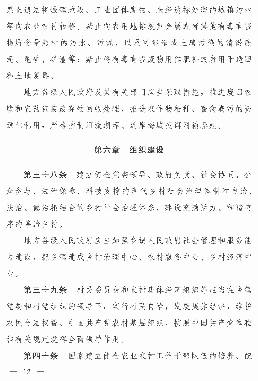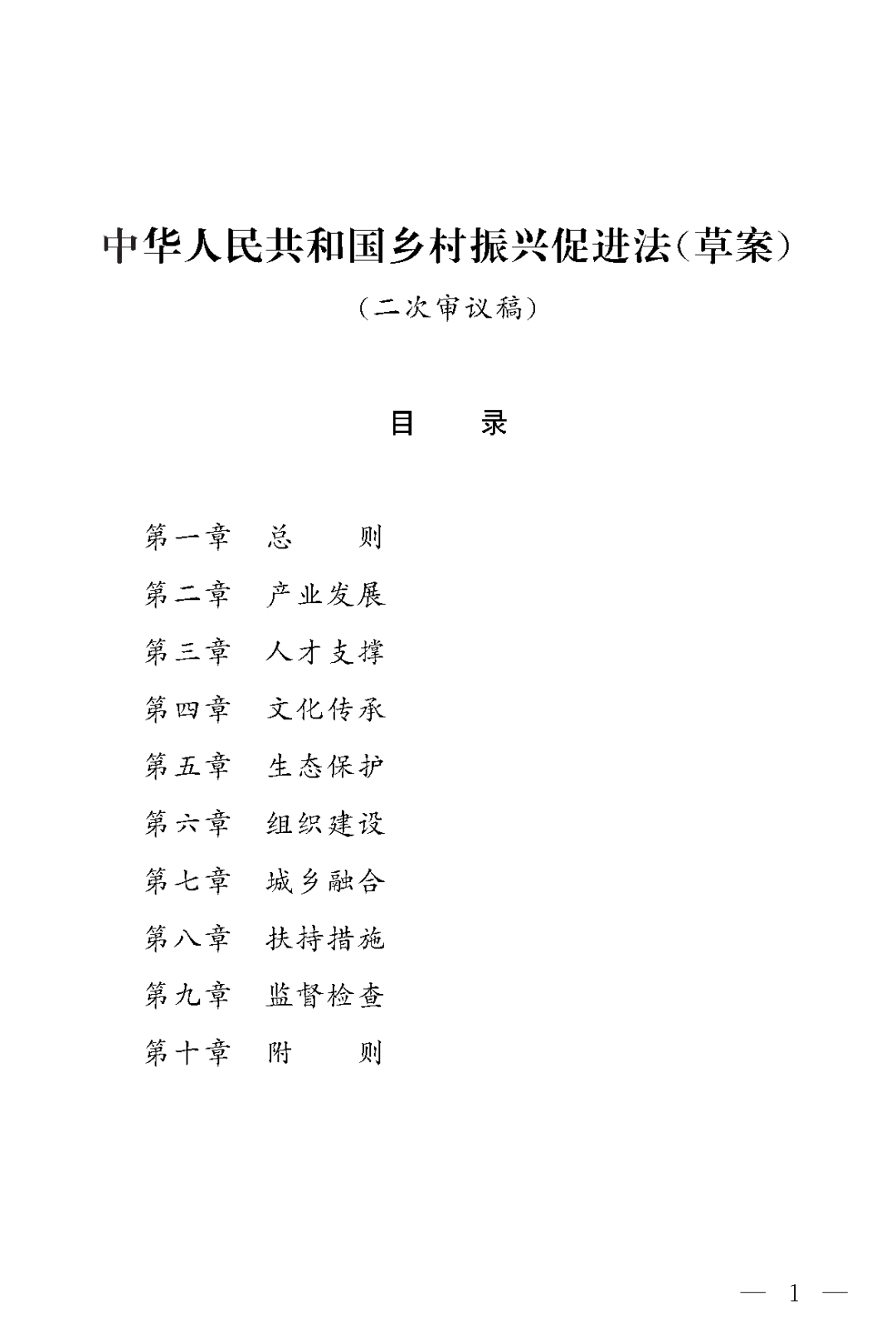 《中華人民共和國(guó)鄉(xiāng)村振興促進(jìn)法(草案二次審議稿)》包含總則、產(chǎn)業(yè)發(fā)展、人才支撐、文化傳承、生態(tài)保護(hù)、組織建設(shè)、城鄉(xiāng)融合、扶持措施、監(jiān)督檢查、附則等共10章71項(xiàng)條款。