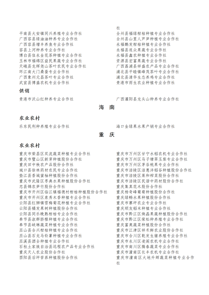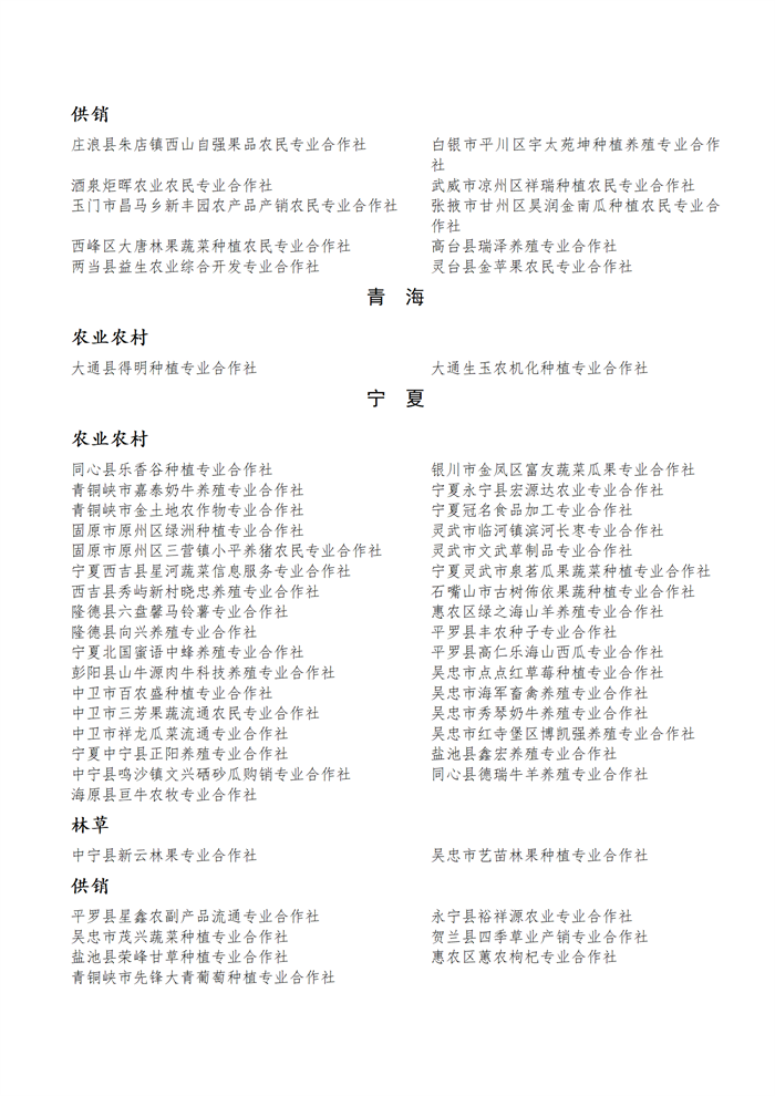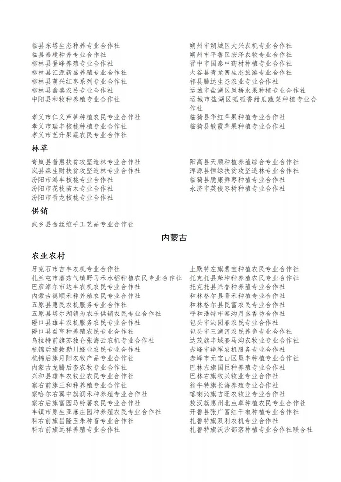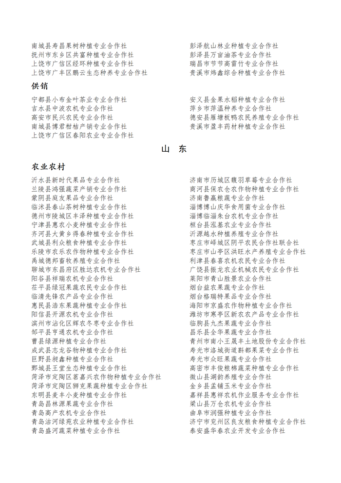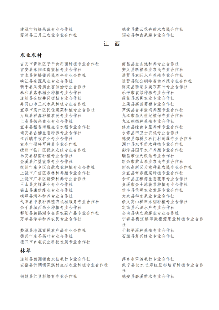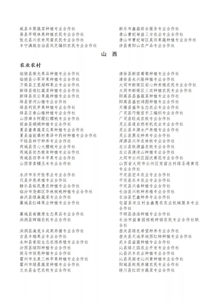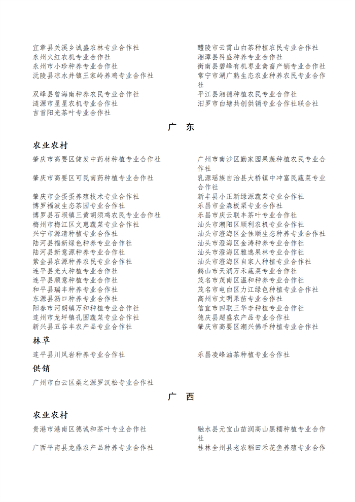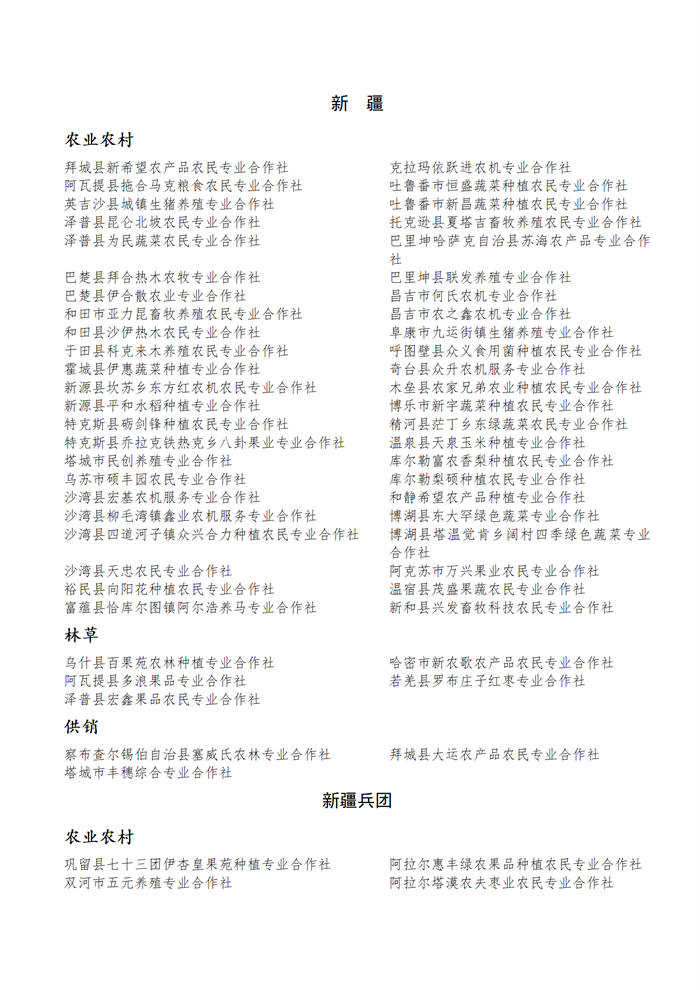 根據《國家農民合作社示范社評定及監(jiān)測辦法》(農經發(fā)〔2019〕5號)有關規(guī)定,農業(yè)農村部會同全國農民合作社發(fā)展部際聯(lián)席會議成員單位開展了國家農民合作社示范社評定,現(xiàn)將名單進行公示,公示期為2021年5月12日至5月20日,聯(lián)系電話:010—59193128。