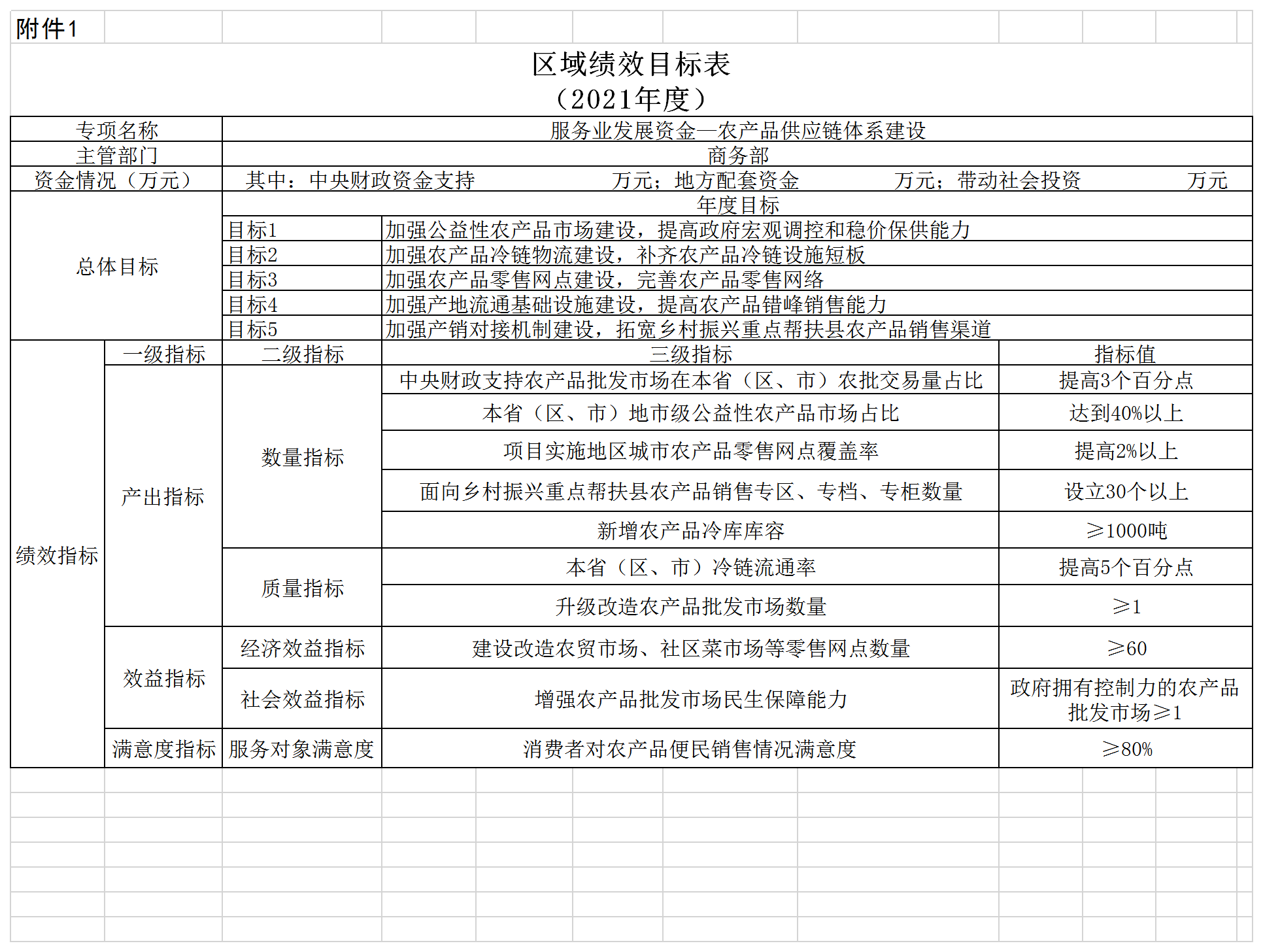 (二)組織地方申報。有意愿省份(包括收到提前下達資金的省份)根據(jù)本通知要求,結(jié)合本地實際情況,制定實施方案,于5月20日前報商務部、財政部,申請中央財政資金支持。實施方案應按照2年工作周期進行編制,要思路清晰、重點突出、目標明確、措施有效、責任明晰、數(shù)字詳實,具體包括以下內(nèi)容:一是本地區(qū)農(nóng)產(chǎn)品供應鏈發(fā)展現(xiàn)狀,重點結(jié)合擬支持方向,提出需要著力補齊的短板和弱項。二是提出任務內(nèi)容、資金支持方式和重點、資金管理、工作機構(gòu)及保障措施等內(nèi)容。三是按支持年度明確提出中央財政資金績效指標(參照附件1),根據(jù)支持內(nèi)容,分類確定不同支持領域可量化的考核評價指標。四是其他需要上報符合實際需要的事項。