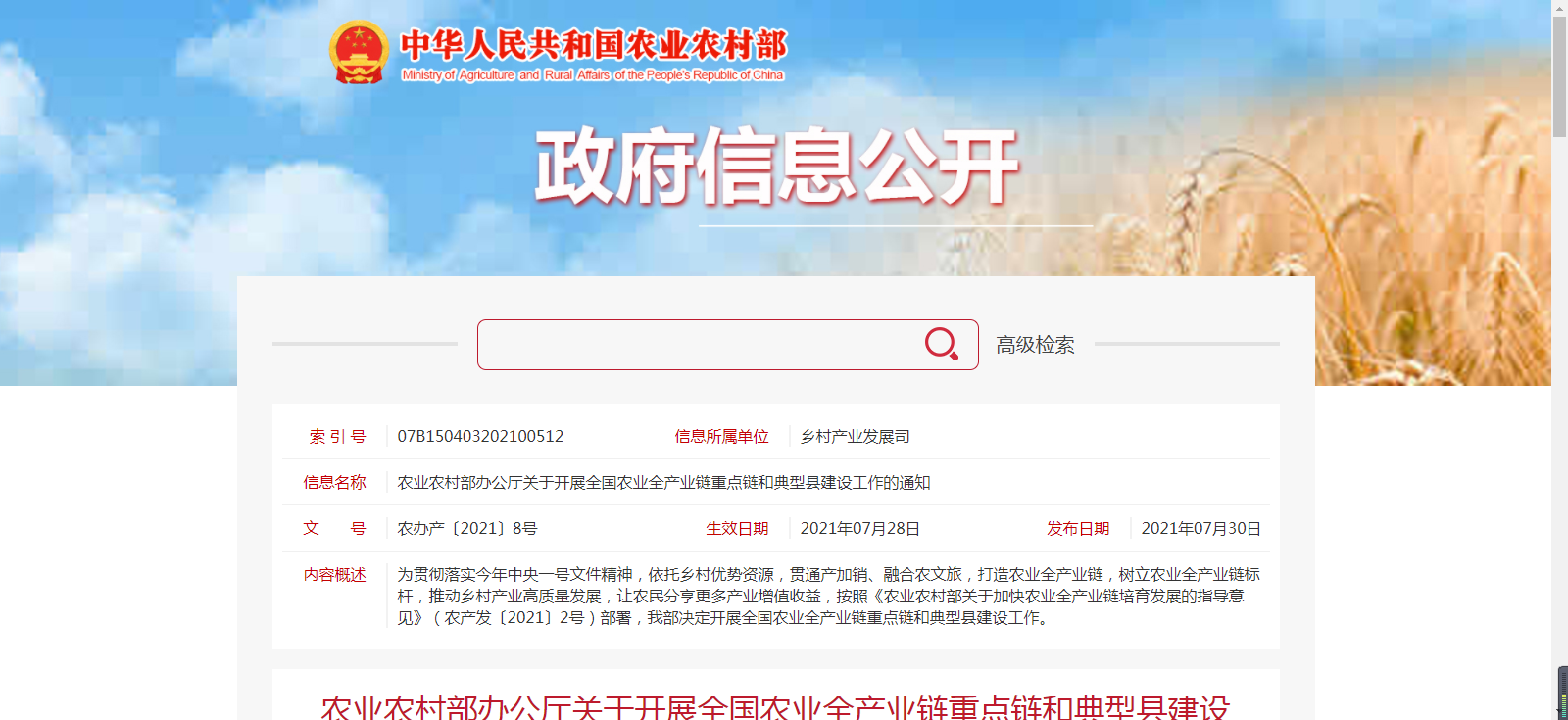 各省、自治區(qū)、直轄市農(nóng)業(yè)農(nóng)村(農(nóng)牧)廳(局、委),福建省海洋與漁業(yè)局,新疆生產(chǎn)建設(shè)兵團(tuán)農(nóng)業(yè)農(nóng)村局: 為貫徹落實(shí)今年中央一號文件精神,依托鄉(xiāng)村優(yōu)勢資源,貫通產(chǎn)加......