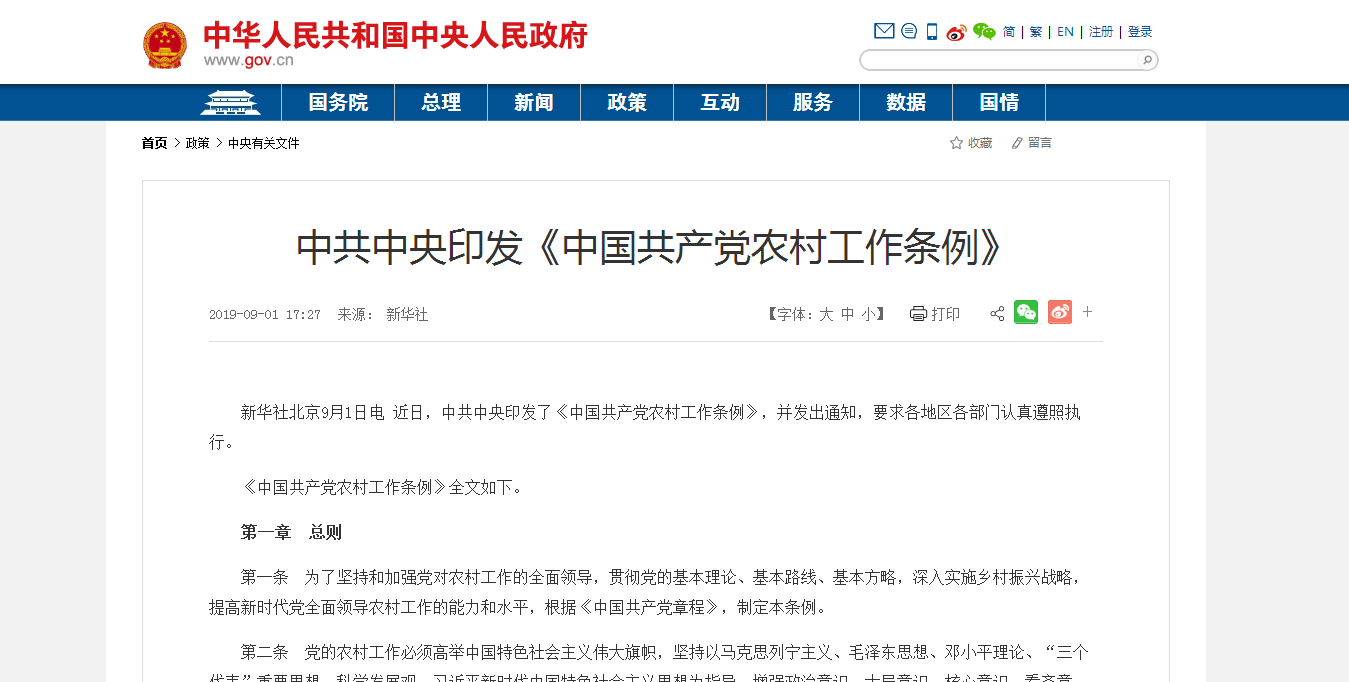 新華社北京9月1日電 近日,中共中央印發(fā)了《中國共產(chǎn)黨農(nóng)村工作條例》,并發(fā)出通知,要求各地區(qū)各部門認(rèn)真遵照執(zhí)行。...