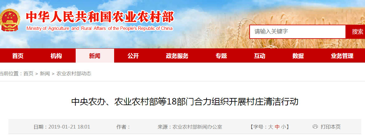 近日,中央農(nóng)辦、農(nóng)業(yè)農(nóng)村部、國家發(fā)展改革委、科技部、財政部、自然資源部、生態(tài)環(huán)境部等18個部門聯(lián)合印發(fā)了《農(nóng)村人居環(huán)境整治村莊清潔行動方案》,組織開展村莊清潔行......