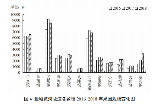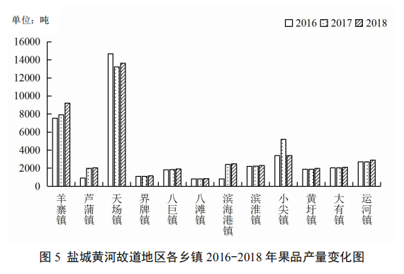 種植規(guī)模林果產(chǎn)業(yè)是鹽城黃河故道地區(qū)的優(yōu)勢特色產(chǎn)業(yè),主要分布在羊寨鎮(zhèn)、天場鎮(zhèn)等鄉(xiāng)鎮(zhèn)的堆上區(qū)域。在種植規(guī)模方面,故道地區(qū)果園面積2016年至2017年增幅較大,2017年至2018年略有縮減(見圖3);截至2018年底,果園面積約為42811.8畝;在果品產(chǎn)量方面,從整體上看,近年來故道地區(qū)果品產(chǎn)量平穩(wěn)上升(見圖3);截至2018年底,果品產(chǎn)量約46327.9噸;分鄉(xiāng)鎮(zhèn)來看,僅天場鎮(zhèn)和小尖鎮(zhèn)果品產(chǎn)量略有起伏(見圖5)。在品種方面,以蜜梨、黃桃、薄殼山核桃、蘋果為主,由于黃河故道沿線為國內(nèi)最宜種植梨地帶,當?shù)孛劾嫫焚|(zhì)較高,已成功注冊“濱海大套蜜梨”國家地理標志;而大套蜜梨主產(chǎn)區(qū)位于濱?,F(xiàn)代農(nóng)業(yè)園區(qū),園區(qū)已建成大套蜜梨5000畝。另外,當?shù)刂Πl(fā)展設(shè)施栽培,目前已建成以大棚西瓜、葡萄、草莓、棚架瓜蔞為主的高效農(nóng)業(yè)示范帶9.60萬畝。