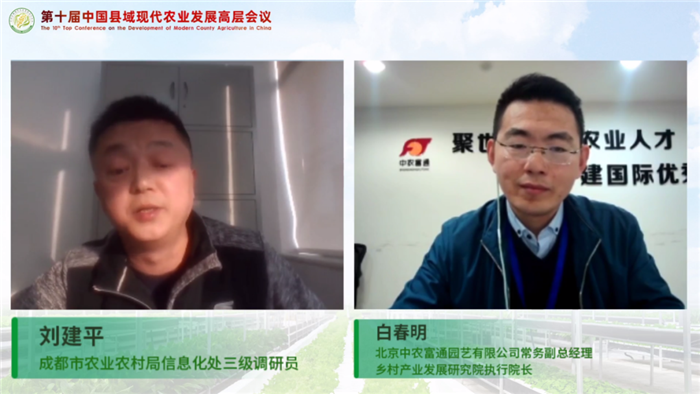 圓桌會議2由中農(nóng)富通鄉(xiāng)村產(chǎn)業(yè)發(fā)展研究院執(zhí)行院長白春明主持,會議圍繞“市縣域農(nóng)業(yè)農(nóng)村信息化建設(shè)推進模式”這一主題展開討論。特邀嘉賓有豐信農(nóng)業(yè)科技服務(wù)有限公司董事長董金峰、成都市農(nóng)業(yè)農(nóng)村局信息化推進處調(diào)研員劉建平、國家農(nóng)業(yè)信息化工程技術(shù)研究中心主任助理吳建偉、聯(lián)通(山西)產(chǎn)業(yè)互聯(lián)網(wǎng)有限公司運城分公司總經(jīng)理張連爭、北京興農(nóng)豐華科技有限公司創(chuàng)始人兼總經(jīng)理張俊青。各位嘉賓分別從理論到實踐,結(jié)合具體案例,為我們分享了縣域數(shù)字農(nóng)業(yè)農(nóng)村的建設(shè)成果、全產(chǎn)業(yè)鏈精細管控,農(nóng)業(yè)信息化項目介紹和推廣運營模式、鄉(xiāng)村經(jīng)濟體與生產(chǎn)關(guān)系等農(nóng)業(yè)農(nóng)村信息化建設(shè)的推進現(xiàn)狀、取得的成效、存在的問題及發(fā)展模式等。與會嘉賓的探討指出,農(nóng)業(yè)專業(yè)社會化服務(wù)、返鄉(xiāng)創(chuàng)業(yè)新農(nóng)人、全產(chǎn)業(yè)鏈大數(shù)據(jù)的建設(shè)以及智慧園區(qū)建成后的運營管理等方面都對縣域?qū)用娴霓r(nóng)業(yè)農(nóng)村信息化建設(shè)和發(fā)展具有很大影響。