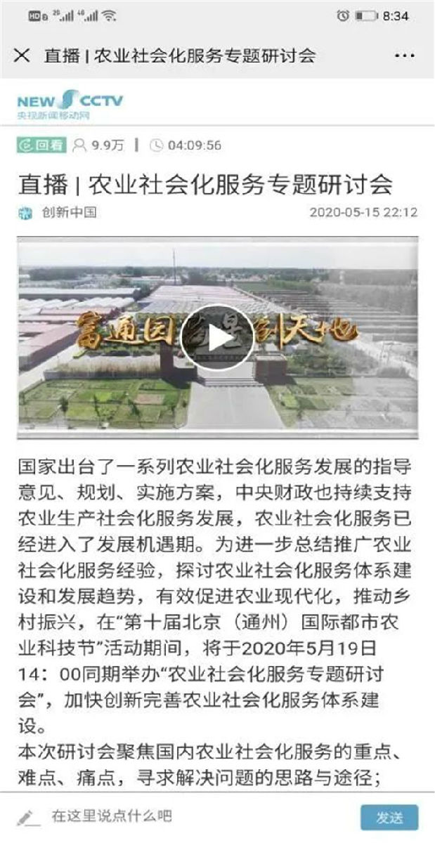 ▼5月19日下午,由北京中農(nóng)富通園藝有限公司、北京國際都市農(nóng)業(yè)科技園、北京富通大潮來農(nóng)業(yè)科技發(fā)展有限公司主辦的“農(nóng)業(yè)社會化服務專題研討會”取得圓滿成功。此次研討會首次采取線上直播的方式。據(jù)19日18點數(shù)據(jù),共10.4萬余人次在線觀看了本次研討會。
