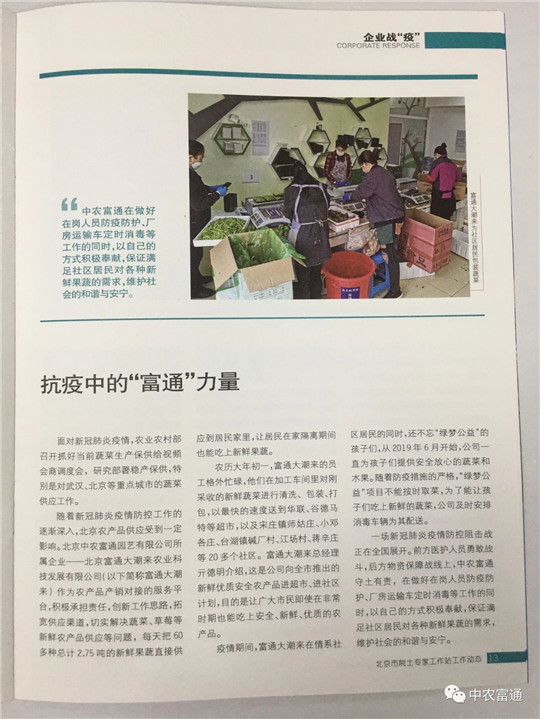 ▼《北京市院士專家工作站工作動(dòng)態(tài)》抗疫???— 抗疫中的“富通”力量。文中記載了中農(nóng)富通在做好在崗人員防疫防護(hù)、廠房運(yùn)輸車定時(shí)消毒等工作的同時(shí),以自己的方式積極奉獻(xiàn),保證滿足社區(qū)居民對(duì)各種新鮮果蔬的需求,維護(hù)社會(huì)的和諧與安寧。