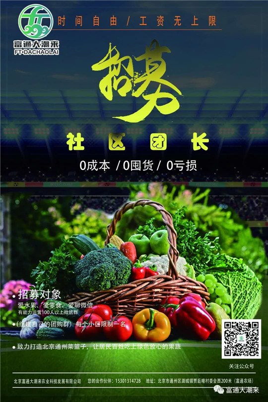 ▼富通大潮來招募社區(qū)團(tuán)長啦!富通大潮來農(nóng)產(chǎn)品供應(yīng)鏈服務(wù)平臺是中農(nóng)富通分支機(jī)構(gòu)—北京富通大潮來農(nóng)業(yè)科技發(fā)展有限公司開發(fā)的專注給社區(qū)提供高性價比產(chǎn)品及服務(wù)的鄰里社交電商平臺,是“社區(qū)+社群+社交”的新型模式,基于鄰居這個特殊人群展開的新型零售業(yè)務(wù),主要提供高性價比的商品/服務(wù)。只要您:是各社區(qū)住戶,或有自己的門店,有空閑時間;鄰里關(guān)系和睦;有能力運(yùn)營100人以上微信群;愛水果、愛零食、愛聊微信就可以加入啦!
