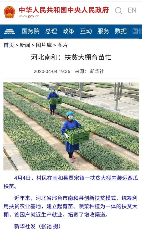 ▼4月4日,中國政府網(wǎng)報(bào)道了中國南和設(shè)施農(nóng)業(yè)產(chǎn)業(yè)集群育苗、蔬菜種植為一體的扶貧模式,為貧困戶就近生產(chǎn)就業(yè),拓寬了增收渠道。(新華社發(fā) 張馳 攝)