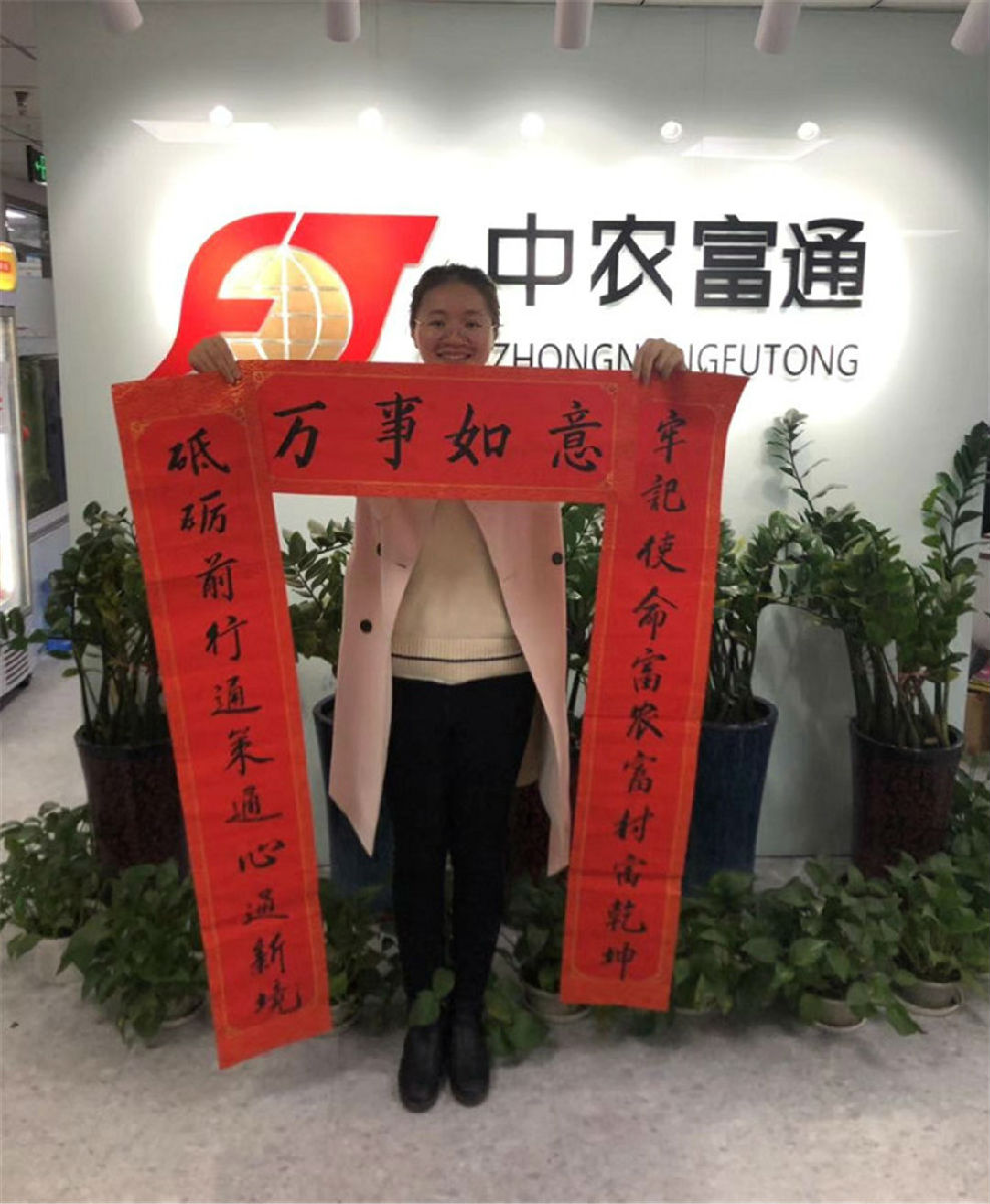 ▼春節(jié)到來之際,中國農(nóng)大書畫協(xié)會許一飛等專家贈予中農(nóng)富通春節(jié)對聯(lián)及福字,表達對中農(nóng)富通的美好祝福,在這里衷心祝愿各位專家新春快樂、鼠年大吉、身體健康、闔家幸福!