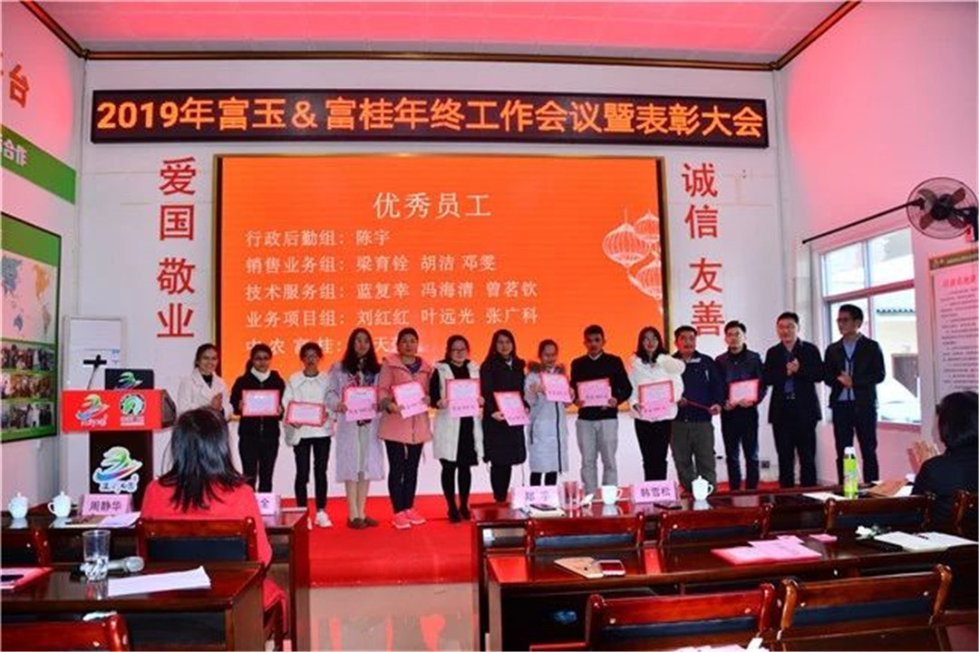 ▼1月17日,廣西中農(nóng)富玉&廣西中農(nóng)富桂公司舉行2019年年終工作會議暨表彰大會,對2019年進行工作總結,對2020年進行展望,并對2019年先進集體和個人進行了表彰。晚上舉行了精彩紛呈的迎春晚會,豐富多彩的節(jié)目展示了富玉員工火熱的激情,2020中農(nóng)富玉定將再創(chuàng)新輝煌!