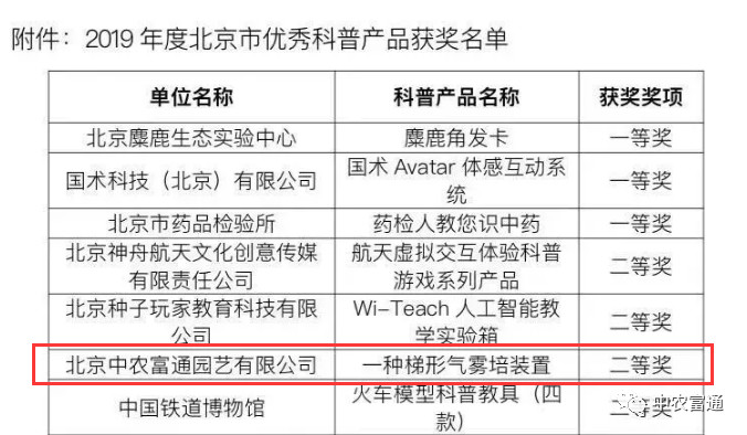 ▼11月7日,北京科普基地聯(lián)盟組織的“2019年度北京市優(yōu)秀科普產(chǎn)品評選”結(jié)果公示,中農(nóng)富通示范基地——北京國際都市農(nóng)業(yè)科技園提交的“一種梯形氣霧培裝置”獲北京市優(yōu)秀科普產(chǎn)品二等獎,“循環(huán)農(nóng)業(yè)-食用菌體驗課程”獲北京市優(yōu)秀科普課程三等獎和網(wǎng)絡(luò)人氣獎。