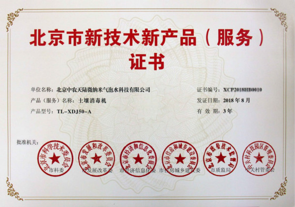 2018年8月,北京中農(nóng)天陸微納米氣泡水科技有限公司(簡(jiǎn)稱(chēng) 中農(nóng)天陸)自主研發(fā)的“土壤消毒機(jī)”通過(guò)北京市新技術(shù)新產(chǎn)品(服務(wù))認(rèn)證。截止到目前,中農(nóng)天陸公司共有四個(gè)產(chǎn)品通過(guò)北京市新技術(shù)新產(chǎn)品(服務(wù))認(rèn)證。