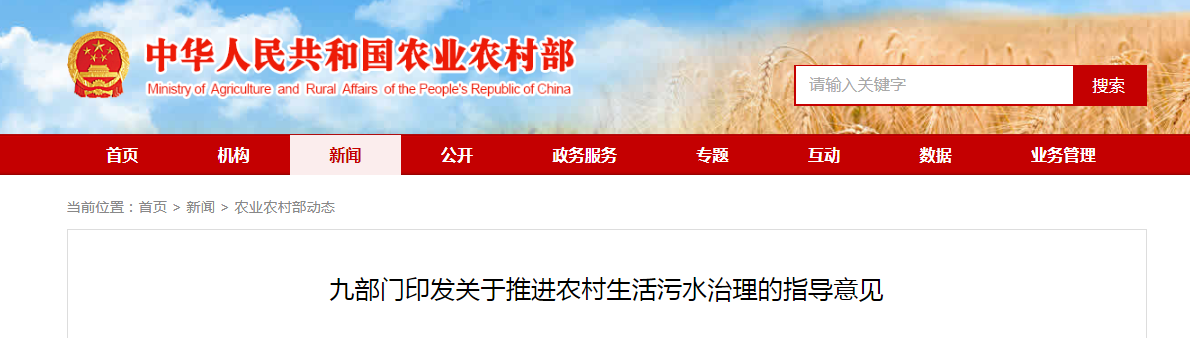 近日,中央農(nóng)辦、農(nóng)業(yè)農(nóng)村部、生態(tài)環(huán)境部、住房城鄉(xiāng)建設(shè)部、水利部、科技部、國家發(fā)展改革委、財政部、銀保監(jiān)會等九部門聯(lián)合印發(fā)了《關(guān)于推進農(nóng)村生活污水治理的指導(dǎo)意見》......