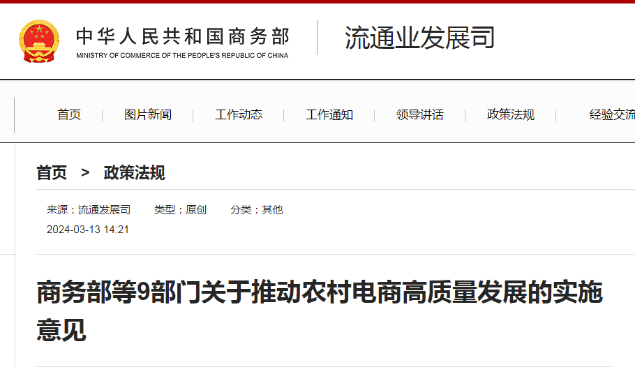近日,商務(wù)部、中央網(wǎng)信辦、財(cái)政部、交通運(yùn)輸部、農(nóng)業(yè)農(nóng)村部、市場(chǎng)監(jiān)管總局、國(guó)家郵政局、共青團(tuán)中央、供銷合作總社聯(lián)合印發(fā)《關(guān)于推動(dòng)農(nóng)村電商高質(zhì)量發(fā)展的實(shí)施意見》?!?.....