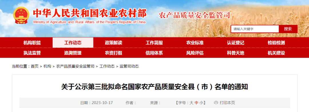 按照《國家農(nóng)產(chǎn)品質(zhì)量安全縣創(chuàng)建活動方案》和《國家農(nóng)產(chǎn)品質(zhì)量安全縣考核辦法》要求,農(nóng)業(yè)農(nóng)村部于2021年起組織開展第三批國家農(nóng)產(chǎn)品質(zhì)量安全縣(市)創(chuàng)建活動?;顒娱_......