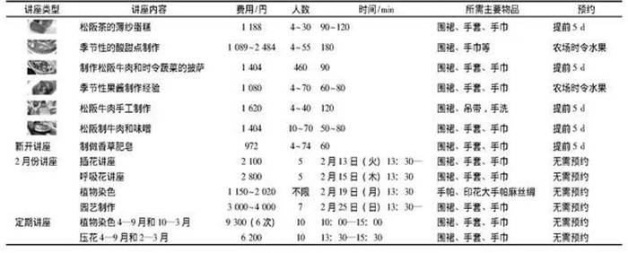 課程講座內容富有特色且細致系統(tǒng), 具有一定的理論深度。上課時間和頻率都較為固定, 有助于培養(yǎng)市民對現(xiàn)代農業(yè)公園的依賴感和歸屬感。公園官方網站上也會及時更新每月講座預告, 并詳細介紹講座內容、時間、地點、限定人數 (部分需要預約) 和費用 (分為會員費用和非會員費用, 表格中的費用為日元円) 以及補充說明需要準備的材料及適合聽講的人群年齡段等非常詳細的信息。